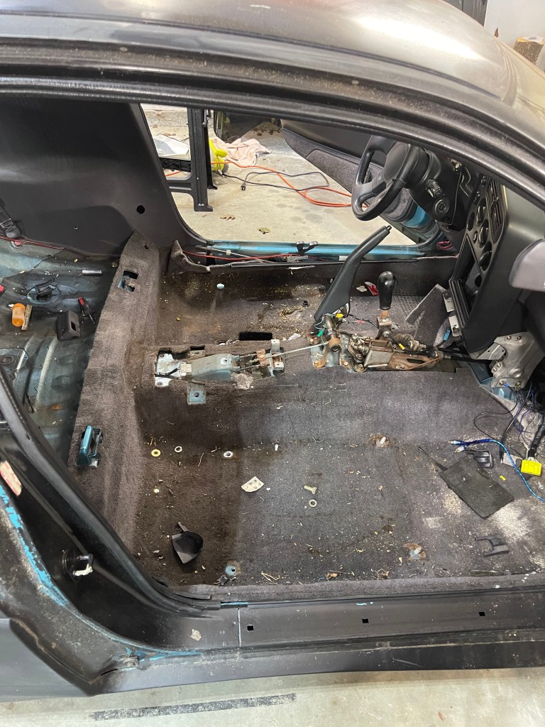 A few days back (5/25/2021) I pulled the bulky parts of the interior out, namely the seats, carpet and headliner. Surprisingly I found out that this car had a 3/5 point harness and a roll cage installed at some point that had been removed. The bottom piece of the 5pt harness was still in the car and the previous owner only had it held in with a single bolt instead of all 3… guess it was for looks since safety obviously wasn’t the goal.
