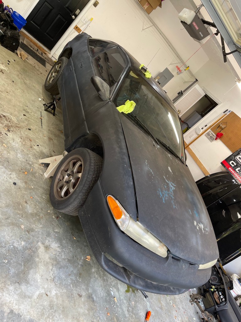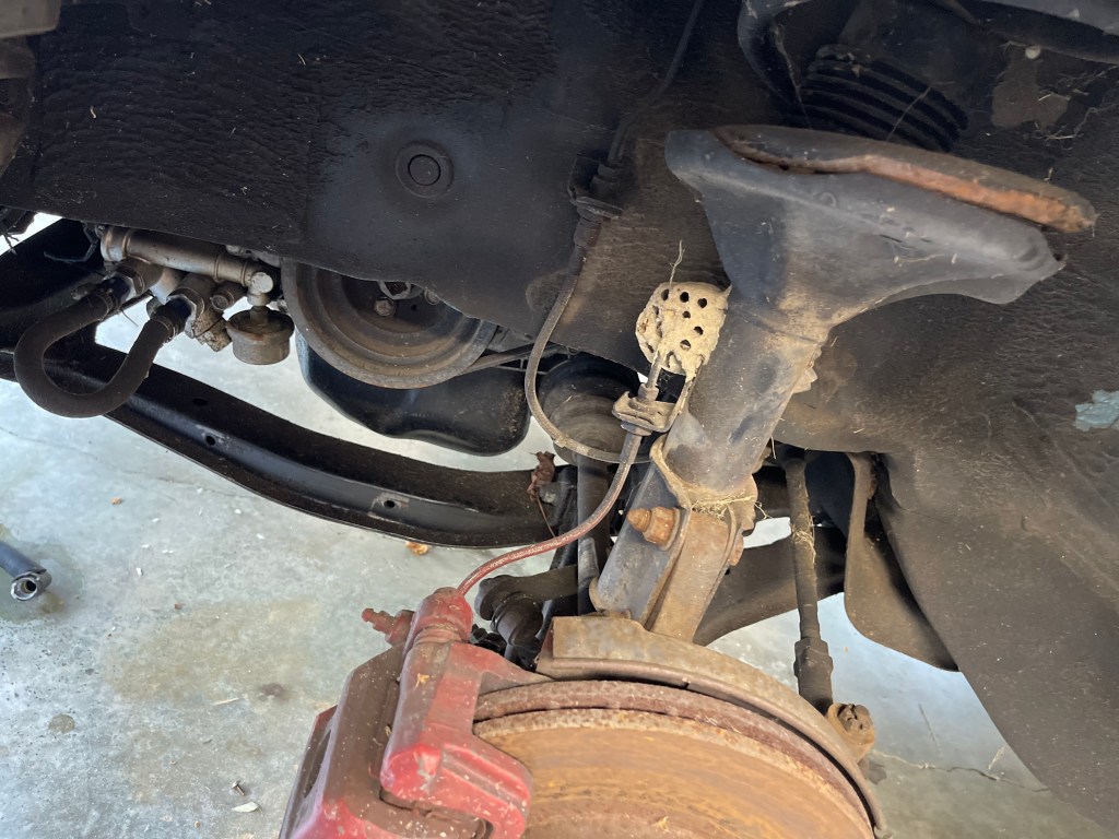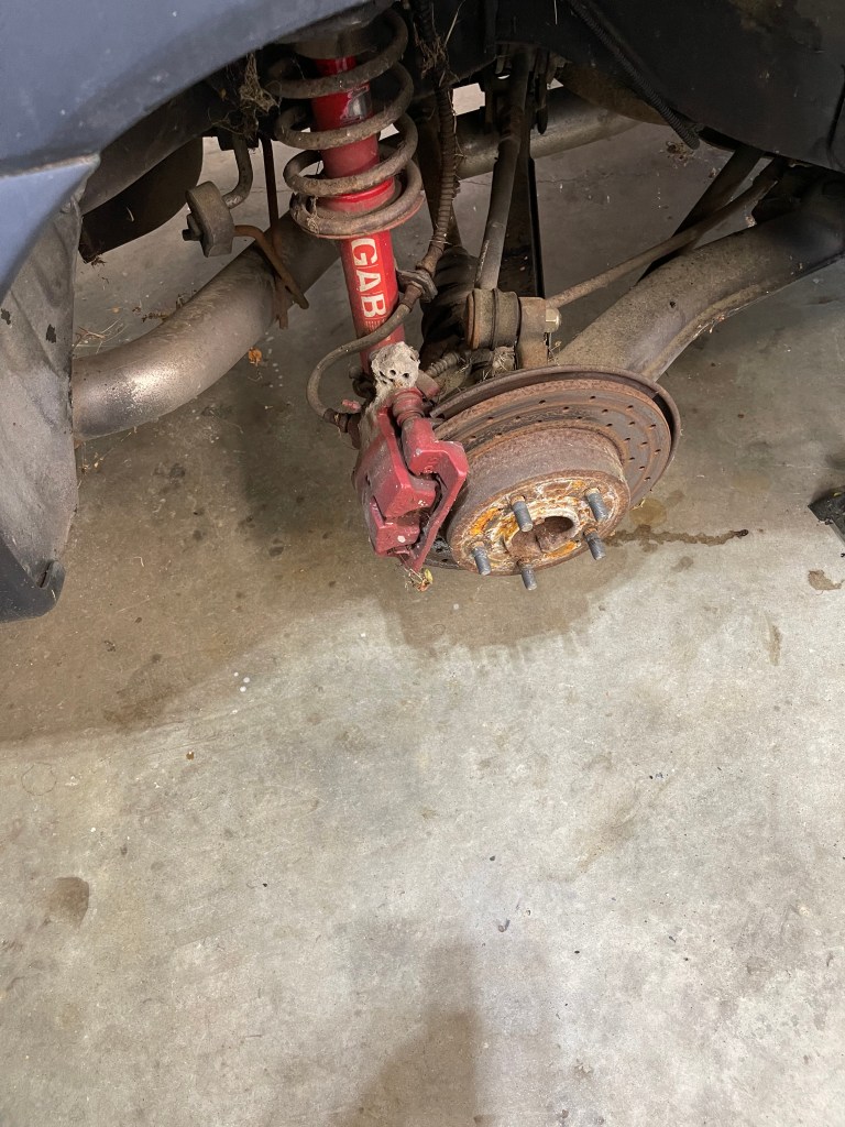 It’s a sweltering 91 degrees outside and probably slightly hotter than that in the garage. I only managed to get the car in the air today and pulled the wheels off.